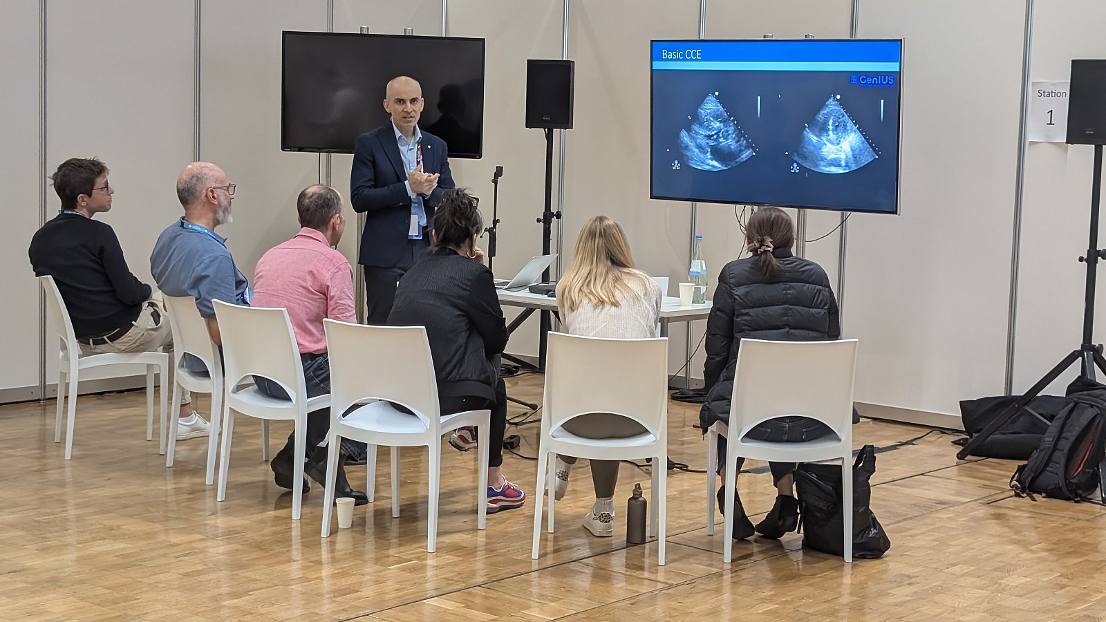 Dopolední blok pokračoval v duchu POCUS: Hemodynamic Assessment, který vedli dr. Balík (EDEC Chair) a dr. Galarza ze Španělska. Nešlo jen o prezentaci, ale o živou demonstraci na figurantovi – včetně využití MAPSE jako parametru longitudinální kontraktility levé komory.
