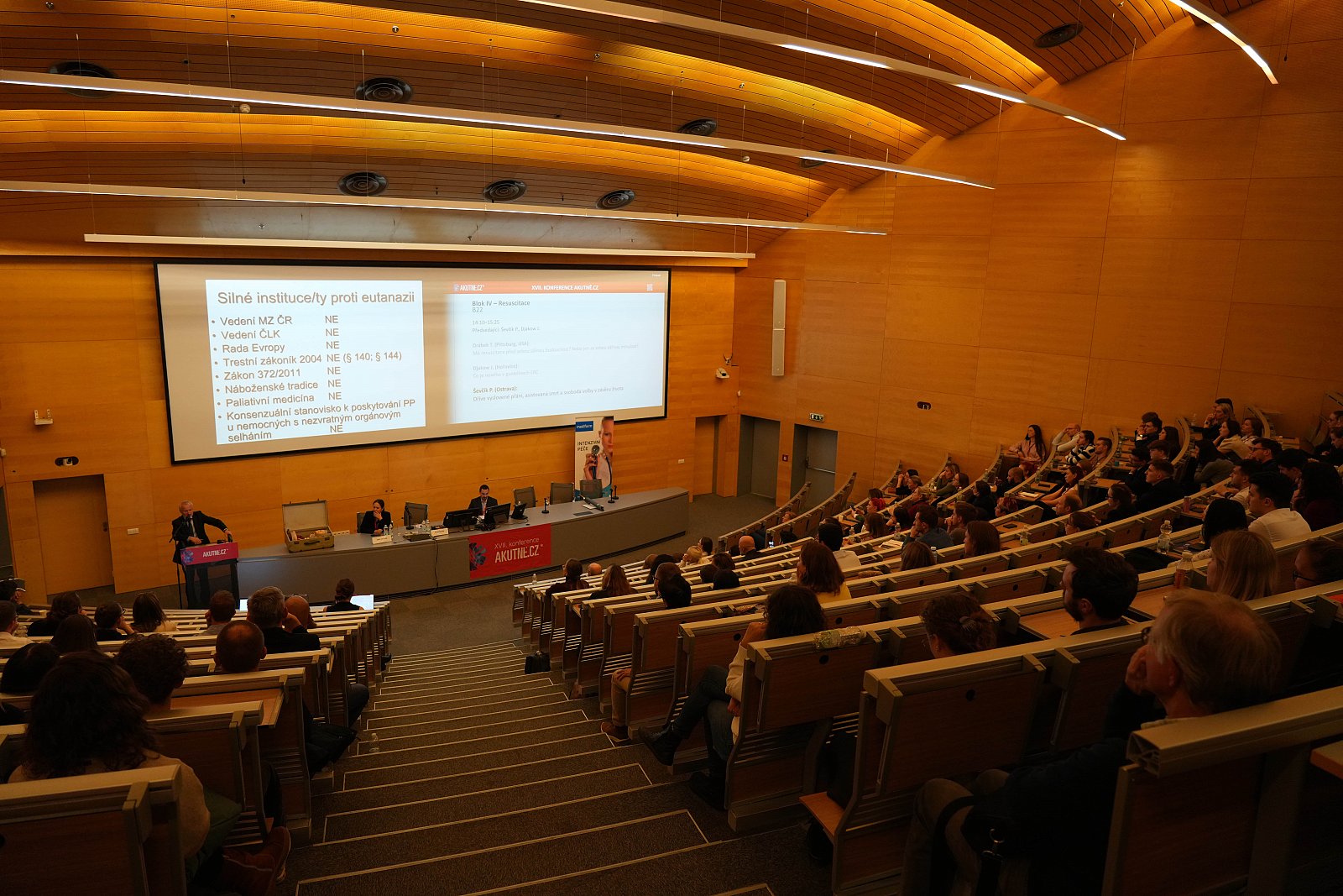 Blok Resuscitace zahájil dr. Drábek (Pittsburgh, USA) přednáškou „Má resuscitace před sebou zářnou budoucnost? Nebo jen za sebou zářnou minulost?“ Úvodem představil historicky předcházející metody oživování pacientů až po vznik moderní resuscitace v 60. letech. Posluchačům ukázal původní model resuscitační Aničky, který věnoval Simulačnímu centru naší lékařské fakulty. Zmínil statistiky přežití po KPR v roce 1961, které bylo až dvojnásobně vyšší než dnes. Dále předložil studie o moderních postupech CPR, ať už s použitím nebo bez použití mouth-to-mouth dýchání, adrenalinu, bikarbonátů, ECMO a jejich úspěšnosti. Další přednáškou, nazvanou „Co je nového v guidelinech ERC“, navázala dr. Djakow (Hořovice), která posluchačům na začátku představila proces tvorby doporučených postupů. Zdůraznila, že cílem resuscitace už není pouze přežití, ale také zachování kvality života pacienta. Pokračovala shrnutím všech novinek v doporučeních ERC, mezi kterými byly například nové infografiky a postupy sepsané laickým jazykem pro širokou veřejnost. Největší změna v BLS (Basic Life Support) se týká přivolání pomoci: po zkontrolování bezpečnosti a oslovení bezvědomého by mělo v případě, že nereaguje, okamžitě následovat přivolání ZZS. Dále zmínila drobné novinky v rozšířené resuscitaci dospělého i dítěte. Dr. Djakow upozornila na stále velký prostor pro zlepšení medicínské etiky a humanizace péče o pacienta. Jako poslední vystoupil dr. Ševčík (Ostrava), který se zabýval tématem „Dříve vyslovené přání, asistovaná smrt a svoboda volby v závěru života.“ Úvodem vysvětlil právní definice dříve vysloveného přání a uvedl populační statistiku jeho výskytu podle vybraných států: v ČR 0–1 %, v USA 37 %, v Německu 45 %. Následně se dr. Ševčík věnoval eutanazii. Uvedl, že české instituce jsou proti asistované sebevraždě, takže konsenzuální stanovisko k eutanazii je negativní, i když by ji podpořily tři čtvrtiny populace. Pokračoval tématem legalizace asistované smrti v západní Evropě, kde například v Nizozemsku tvoří takto asistovaná úmrtí přibližně 5,4 % všech úmrtí. Přednášku doplnil příběhy konkrétních lidí, které sloužily jako přesvědčivé argumenty pro přehodnocení právního stanoviska v ČR – „je pro mě důležité, že mohu mít život ve vlastních rukou“. Blok uzavřel myšlenkou, že letting die a killing nejsou z pohledu lékaře totožné.