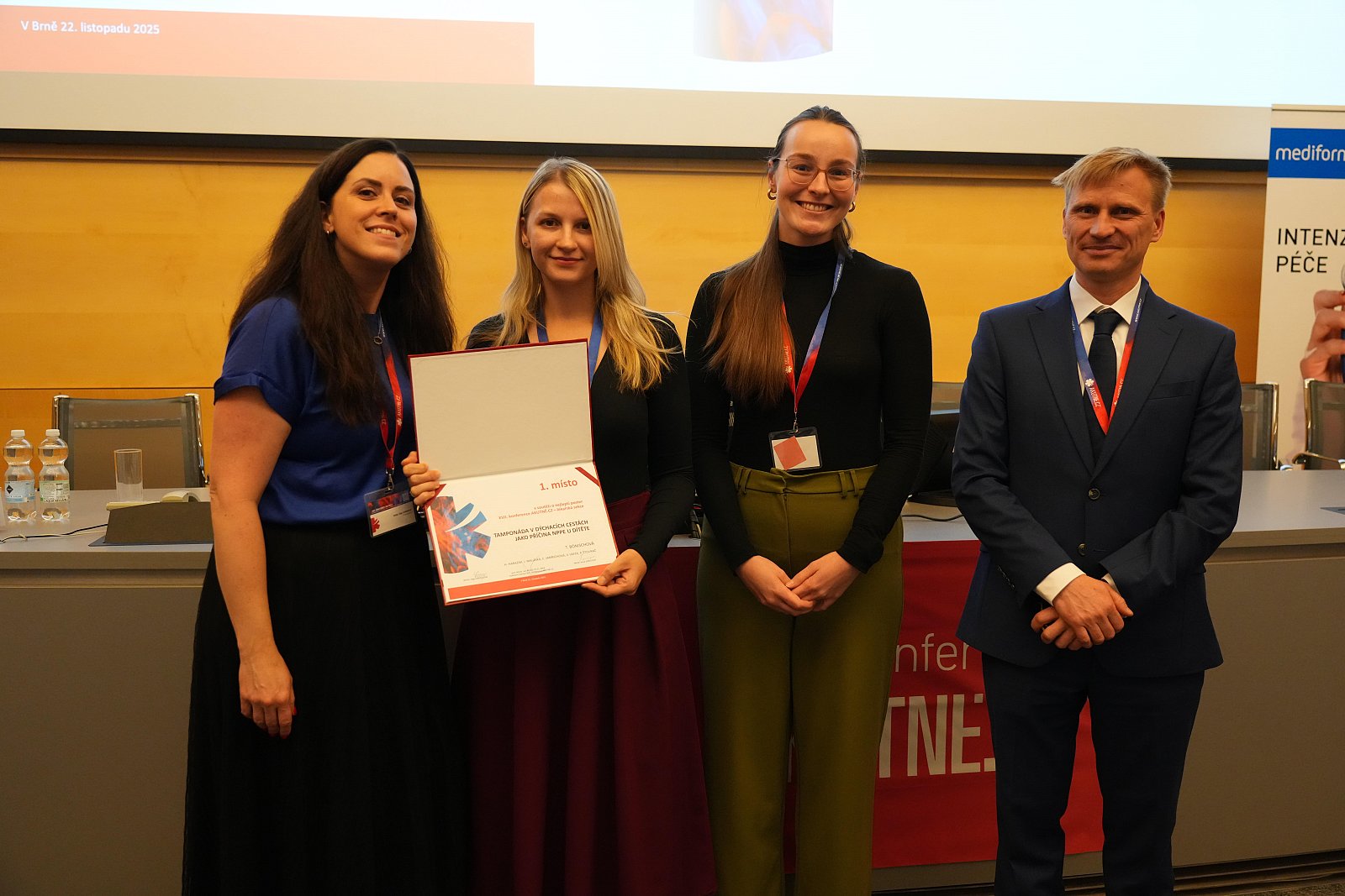 Slavnostního zahájení se tradičně ujal dr. Štourač a přivítal všechny zúčastněné, kteří si v sobotu ráno přivstali. Děkan LF MU dr. Repko pozdravil účastníky a popřál všem příjemný zážitek. Dále se slova ujal dr. Gál, přednosta KARIM FN Brno. Popřál všem příjemně strávený čas a úspěchy v další profesi. Mikrofon koloval k doktorovi Čuderlemu, který přijel pozdravit Konferenci za ARK FNUSA a poděkoval všem organizátorům za skvělou práci. Z Plzně přijel dr. Beneš, který stojí za projektem Akutních střed na portálu AKUTNĚ.CZ a je vědeckým sekretářem ČSARIM a zástupce ČSIM. Poděkoval za hojnou účast a inspirativní konferenci. Poprosil také auditorium o participaci na vyplnění dotazníku Anesteziologická cesta. Dr. Djakow, zástupkyně ČR v ERR plynule navázala na včerejší kongres Resuscitace, ve kterém vystupovala jako hlavní autorka pediatrických guidelines. ČRR a AKUTNĚ.CZ jsou partneři a mají mnoho společného. Dr. Mrozek, zástupce České lékařské komory, apeloval na zachování dobrých pracovních podmínek. Dr. Pycz a dr. Klincová za SMAI popřáli všem dobré ráno. Dr. Klincová poděkovala všem členům SMAI a dr. Pycz poděkovala za důvěru jí svěřenou, zmínila také, že fond mobility umožnil již 127 lékařům účast na odborných akcích v celkové hodnotě 1 600 000 Kč. Patron NF AKUTNĚ.CZ, Pavel Tomeš, popřál všem zdravou drzost a hlavně pozval všechny účastníky na společenský večer, kterým bude provázet právě on. Dále zaznělo z úst dr. Štourače poděkování všem partnerům, díky jejichž pomoci se mohl XVII. ročník konference uskutečnit. Po uvítací řeči nastal čas na vyhlášení Ceny Jiřího Macha za nejlepší publikaci autora do 35 let. Diplomy si odnesly dvě práce autorů: Štěpána Bartoše a Tamary Skříšovské. Výhercům moc gratulujeme. K zahajovacímu ceremoniálu patří také křest odborných publikací. Letos teklo šampaňské knize dr. Malásky - Abeceda intenzivní medicíny, na jejíž tvorbě se podílelo 25 brněnských autorů. Osobností AKUTNĚ.CZ se pro rok 2025 stala Dr. a Klincová.