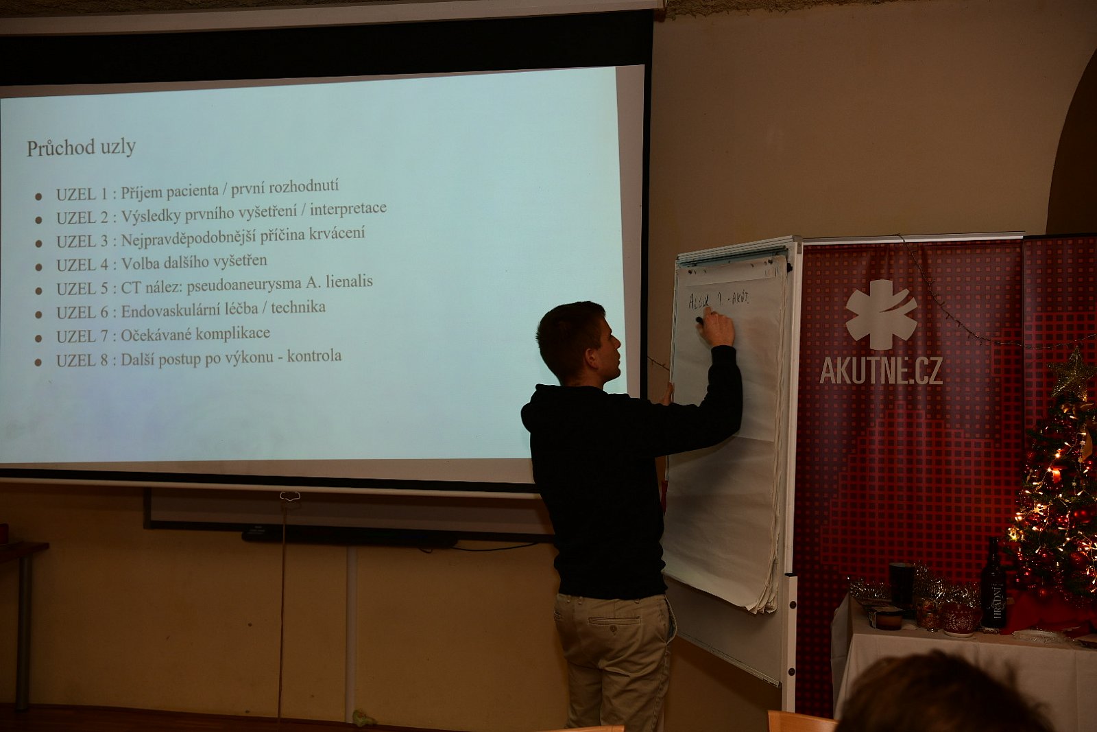 Výjezdní zasedání bylo slavnostně zahájeno tzv. Štědrovečerní večeři, kde se strávníci mohli těšit na výběr z řízků kuřecích, rybích či vegetariánského menu. Pochopitelně nemohl chybět bramborový salát ať už tradiční nebo ten, jehož výtečnou chuť doplňují jablka. Kouzelnou atmosféru Vánoc dokreslila i krásná výzdoba a talíře s vynikajícím cukrovím. A co by to bylo za Štědrý večer, kdyby nedošlo na rozbalování dárků. Pod Akutním stromečkem bylo tolik místa, že Ježíšek mohl každému nadělit dáreček, co potěší :) Po hostině si všichni přítomní měli možnost vyslechnout cestovatelskou přednášku a zážitky z cest od pana profesora Ševčíka. No a ti největší fajnšmekři si počkali na promítání té nejlepší pohádky všech dob - S čerty nejsou žerty.