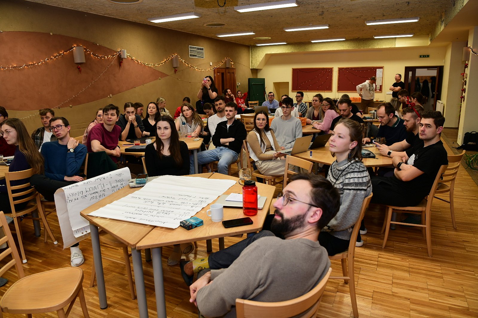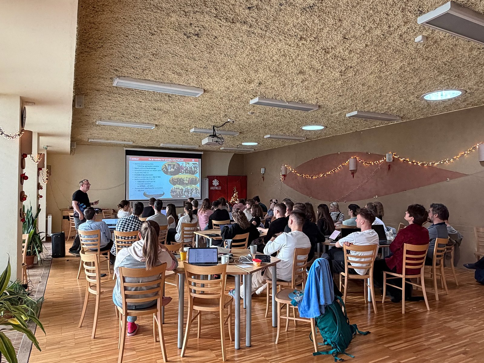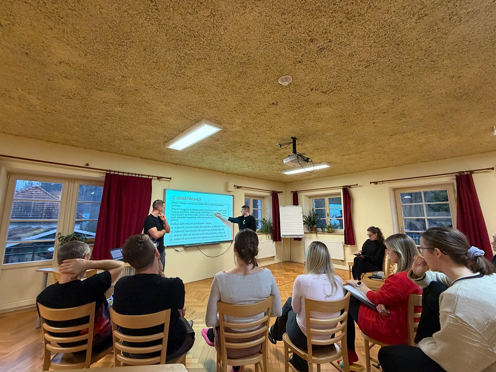 Sobotní ráno, zahalené v nepropustné mlze skoro vybízelo k tomu, zachumlat se do peřin a zůstat tam. To ale nebyl případ ,,akutňáků”, kteří po snídani vyrazili na zevrubný průzkum Moravského krasu! Výprava se navzdory výzvám terénu i počasí obešla bez zranění. Po výtečném obědě se pomalu ale jistě blížila část pracovní, která začala přednáškou Petra Štourače, v níž každoročně shrnuje úspěchy portálu za rok 2025. A že jich bylo! Obhajoby disertačních prací, atestace, ocenění publikačních činností a nesmíme zapomínat i na úspěchy v osobním životě - ,,akutňácká rodina” se opět rozrostla o pár miminek :). Poté se už všichni spolupracovníci s vervou sobě vlastní pustili do díla. Čekala je práce v tzv. focused groups, kde prezentovali své rozpracované algoritmy a ladili úpravy, aby v červnu vše bylo hotovo a čtenáři portálu nalezli na webu novou várku virtuálních pacientů. Sobotní den vyvrcholil Silvestrovskou párty ve velkém stylu - nemohly chybět ani věhlasné ,,Akutní drinky” či populární ping pongový turnaj Ťoula cup! A kdopak letos zvedl nad hlavu vítězné trofeje? Nebyl to nikdo jiný než sám Petr Štourač a Kateřina Pořízková, obhajující titul z loňského roku.